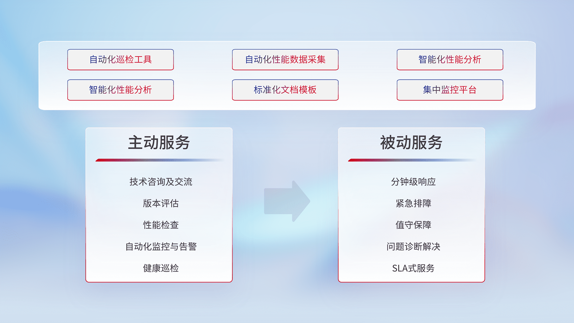 智能化工具和标准化文档,,,保障服务质量,,提供主动服务(包含技术咨询、、版本评估、、性能检查、、、、自动化监控与告警、、健康巡检)和被动服务包含(分钟级响应、、、、紧急排障、、、、值守保障、、问题诊断解决、、、、SLA服务)。。。。