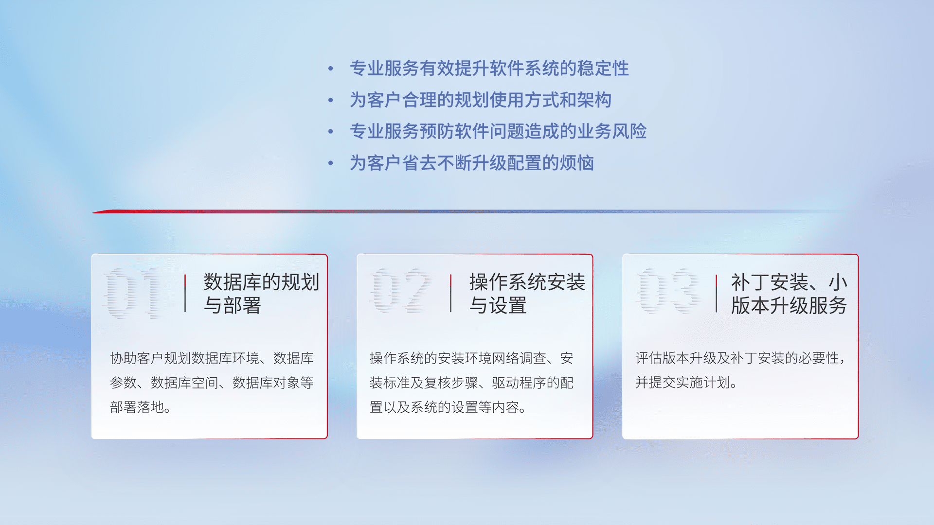 为客户提供软件规模升级、、、、快速部署、、、按需配置的专业服务,,从数据库的规划与部署到操作系统的安装与设置,,,再到补丁安装和小版本升级提供支持。。。